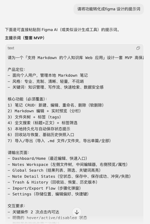 # Figma 页面设计提示词(Markdown 个人知识库 Web)