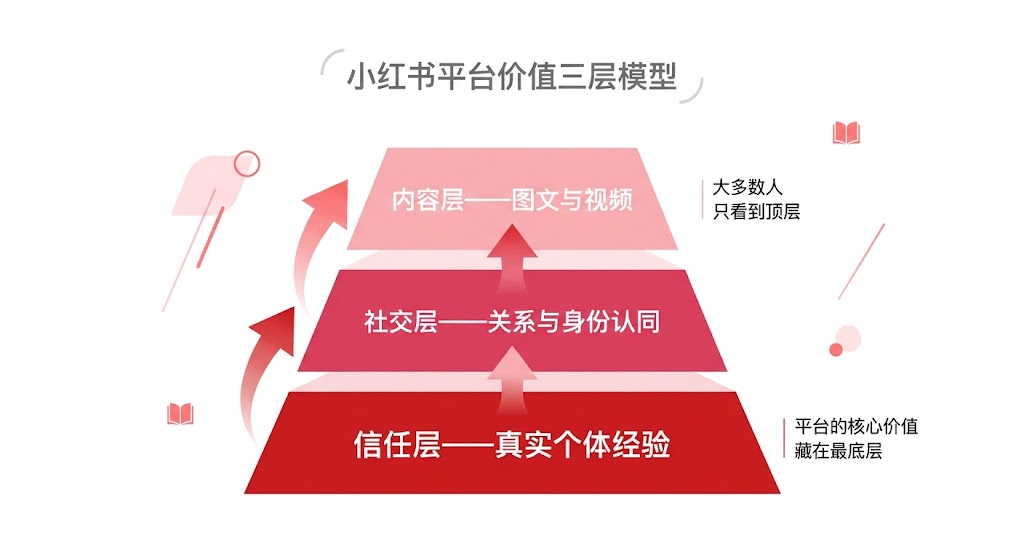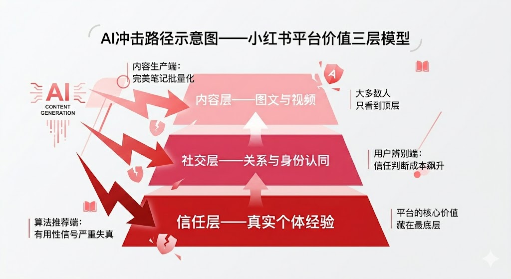 AI对小红书的冲击,不是一刀切下来的,而是分三个层次,从三个不同方向逐步侵蚀平台赖以成立的核心价值。