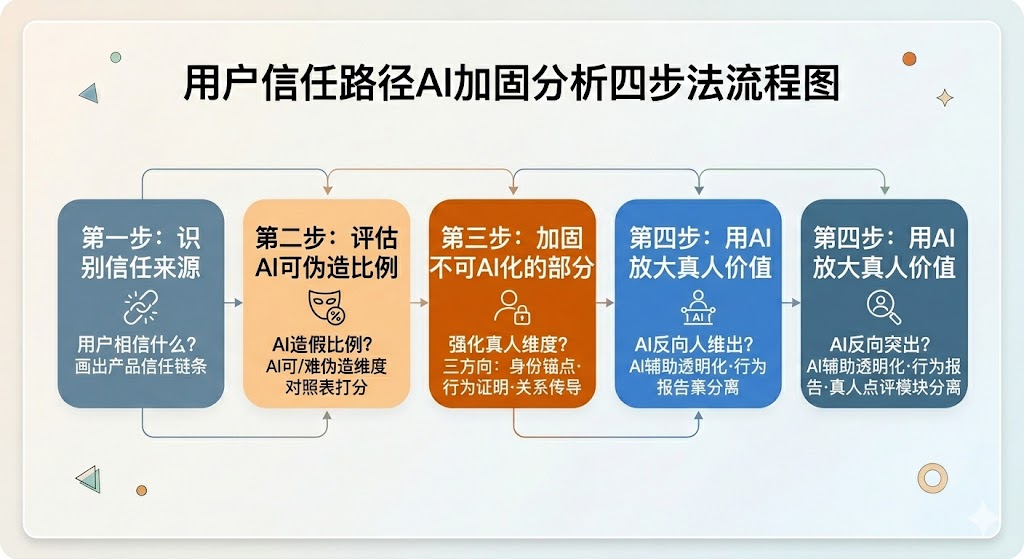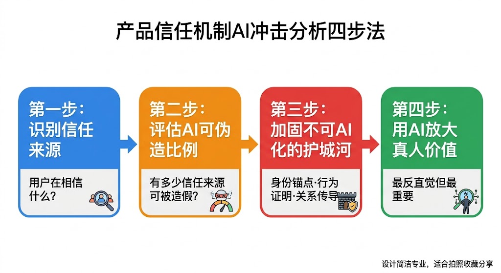 今天就可以开始的一个行动:把你现在负责的产品,用本文的四步框架走一遍。画出信任链条,评估AI可伪造比例,找到你真正应该加固的护城河。