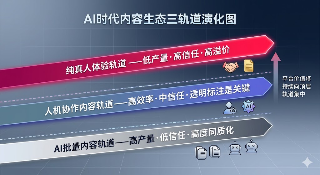 内容质量的门槛被AI拉平了,但内容的”来源可信度”没有被传递出来。平台里内容的外在质量在提升,但用户信任这些内容的底层理由,正在被悄悄抽空。