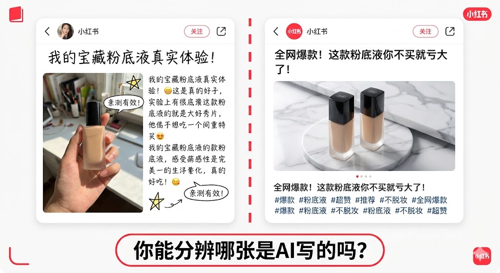 这意味着:任何人,哪怕从来没用过某款产品,都可以用AI生成一篇看起来”真实感十足”的笔记——视觉美观、语气自然、关键词精准、排版专业。唯独缺少真实体验那个部分,被AI用“似乎真实”的表达完美掩盖了。