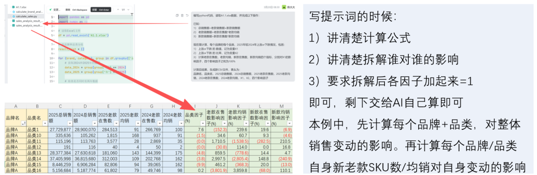 计算指标异动时,哪个维度贡献大;计算每个子指标的异动贡献占比,也可以丢给AI做,只要写好逻辑,AI生成python跑一遍就出结果,每个月能省非常多的事(如下图)