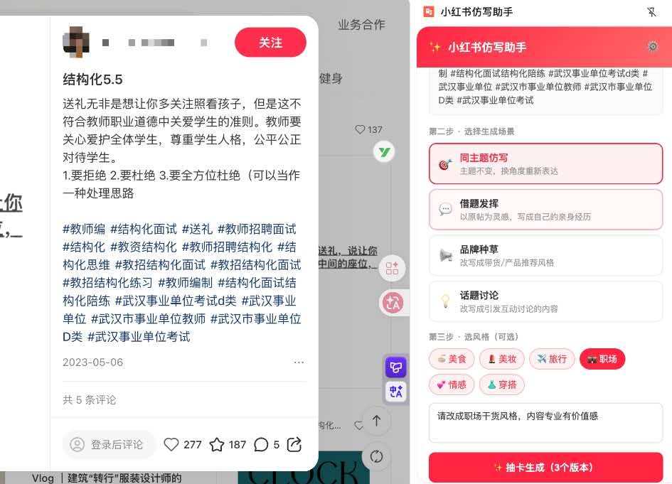 但她没有开玩笑。她打开浏览器,当着我的面演示:打开一篇小红书帖子,点击插件图标,右侧弹出侧边栏,自动读取帖子的标题、正文和标签,选一个仿写场景,点击生成——不到 20 秒,三个可以直接编辑的仿写版本出现在屏幕上。