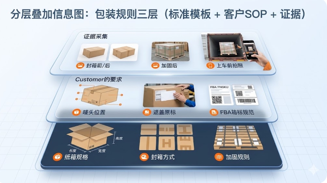 - 客户要求:客户维度的包装SOP(例如唛头位置、遮盖原标、外箱贴FNSKU/箱标等)。