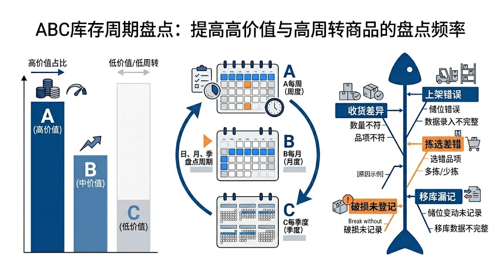 ABC循环盘点的意义在于:高价值、高周转SKU更频繁地被验证,差异更早暴露,流程更容易持续改进。