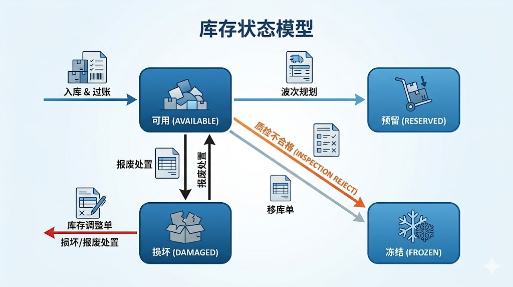 - 损坏/报废库存:不可交付,进入处置与对账流程
