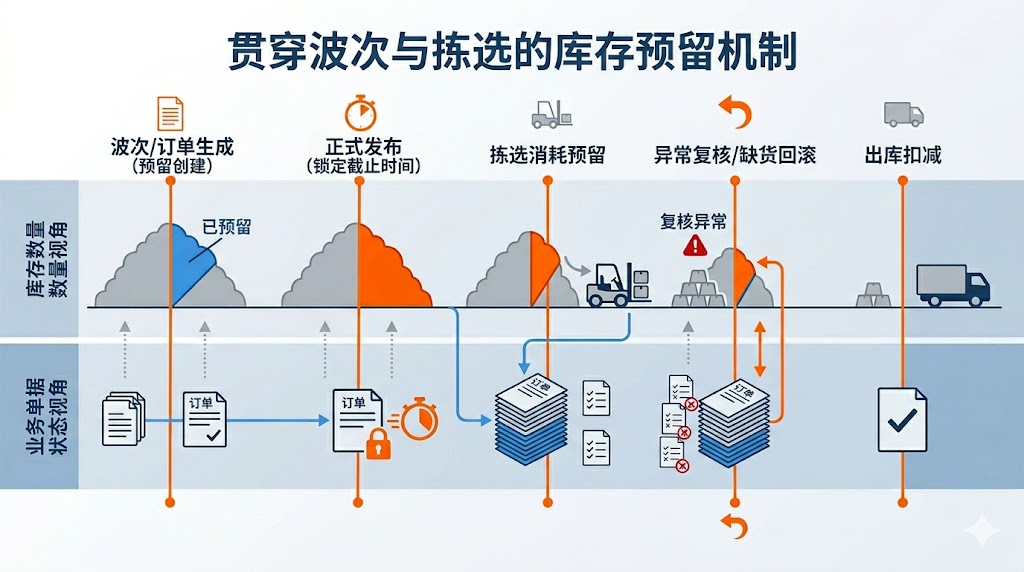 货代仓常见的体验割裂是:波次规划时显示有货,拣选时发现没货。根因往往是缺少严格的预留机制。