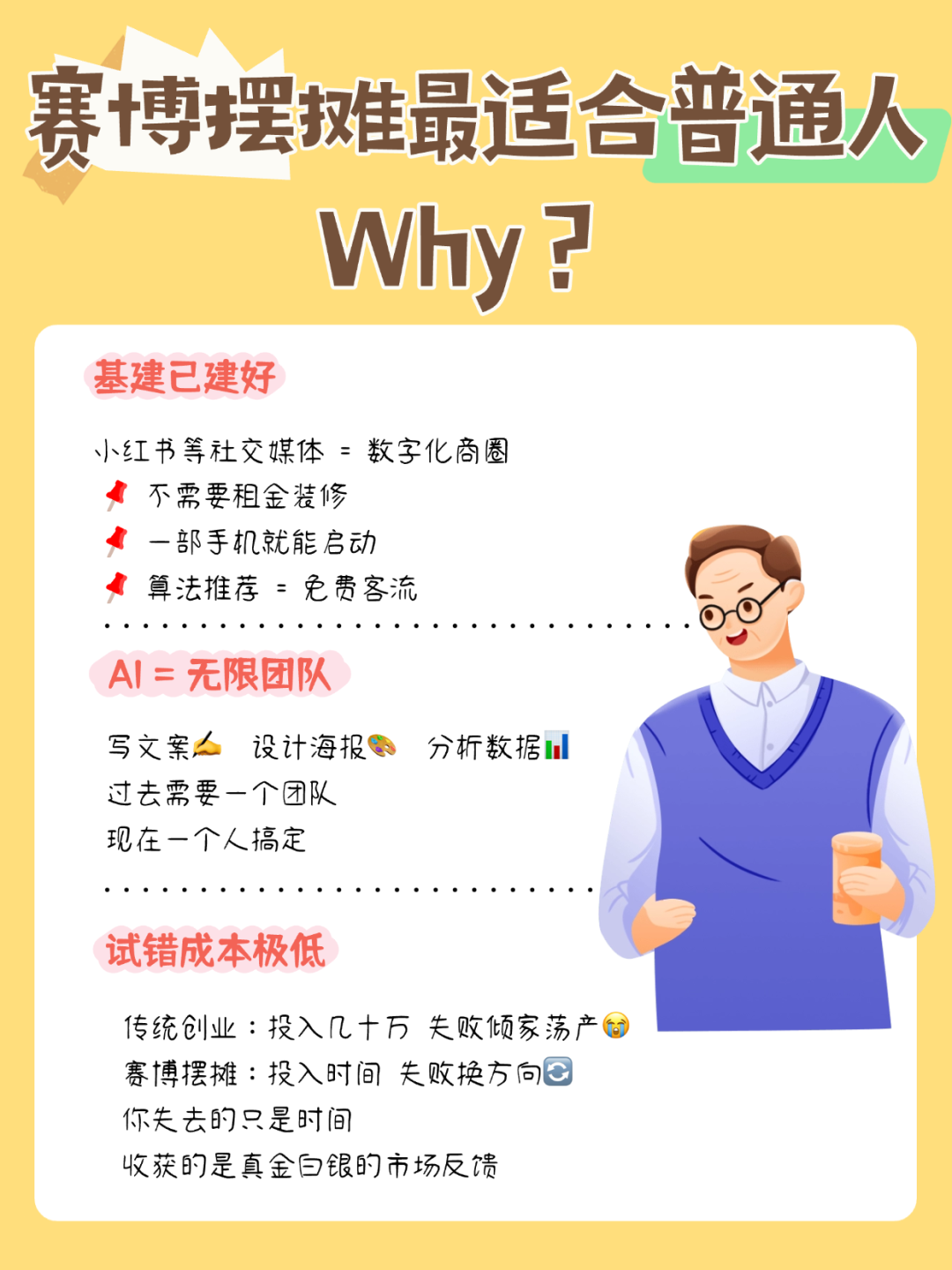 比起殚精竭虑、赔笑应酬,“事少钱多离家近、老婆孩子热炕头”更适合正常人。而赛博摆摊恰恰是普通人利用互联网赚钱的最佳方式,原因有三: