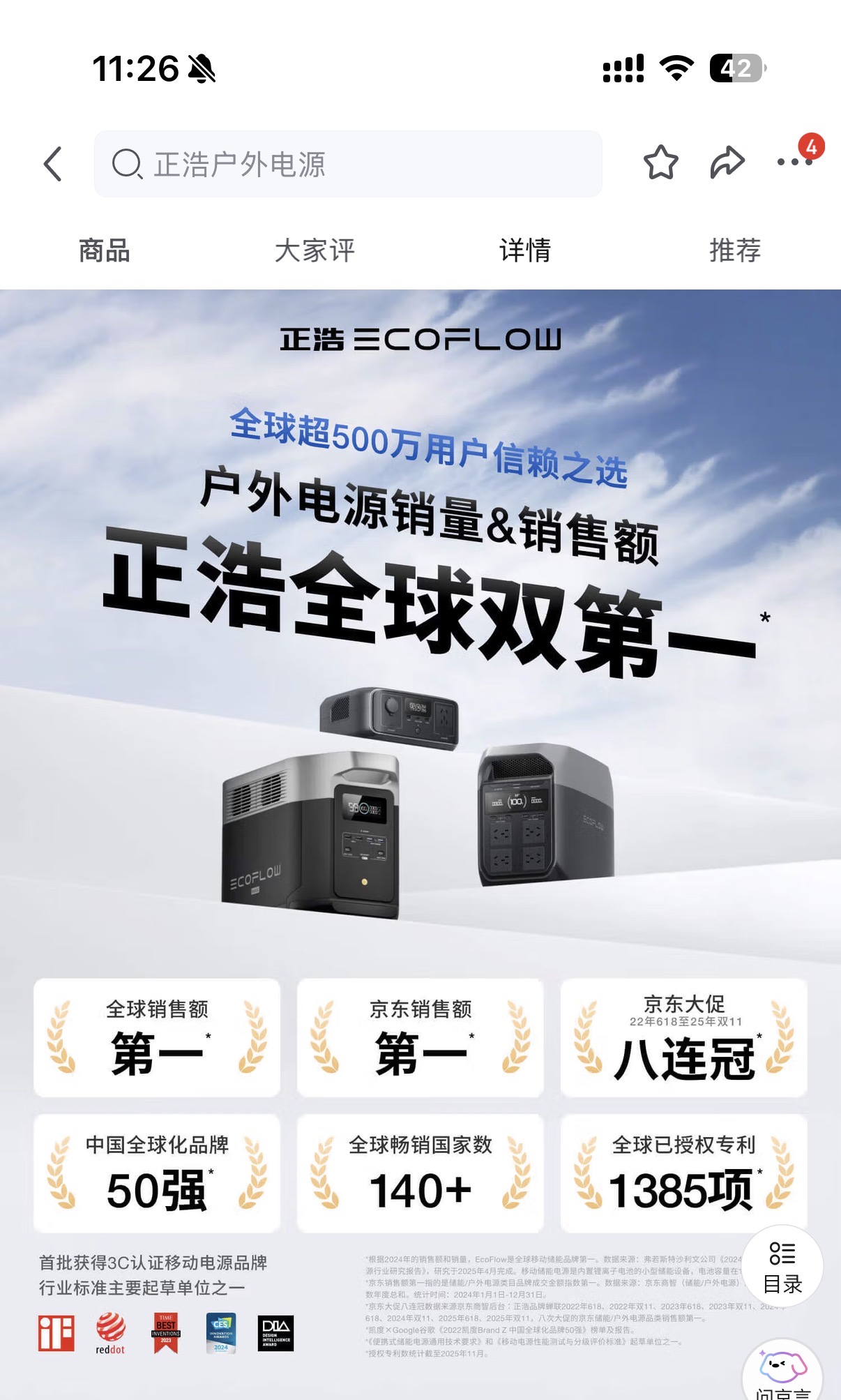 从京东其商品详情页可以看到:EcoFlow 位居全球销售额第一、京东销售额第一,也是中国全球化品牌50强。毫无疑问,这是一个已经非常成功的品牌。