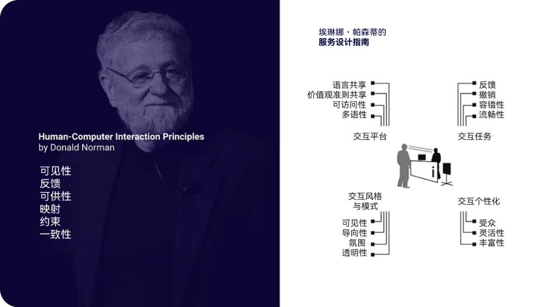 当我和罗伯塔·塔西(Roberta Tassi)开始思考有助于指导 AI 体验设计的原则时,我们从唐·诺曼(Don Norman)的人机交互原则,以及埃琳娜·帕琴蒂(Elena Pacenti)在米兰理工大学攻读博士学位期间所制定的服务设计准则中汲取了灵感。