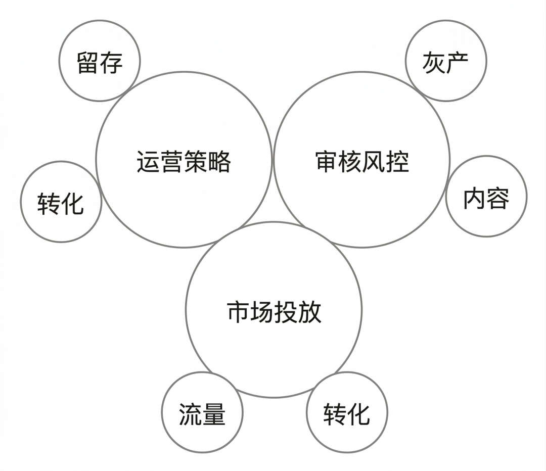 看过我去年写的《做了“风控审核岗”,都得看心理医生?》一文的朋友就知道,1v1陪聊社交产品的核心大盘,无非是三大板块:运营策略、市场投放、风控审核。