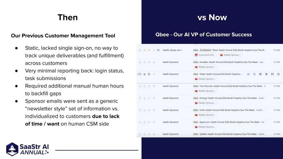 故事要从两年前说起。SaaStr 一直在用一个现成的赞助商门户工具——没有 AI 功能,没有单点登录,没法追踪每个客户的独立交付物,连客户有没有登录过都看不出来。