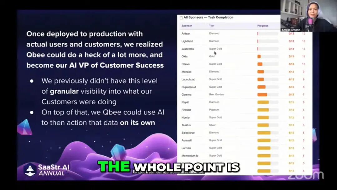 10 万美元平均单价的客户,仍然是定制化流程。Amelia、David 和 Jason 本人都还参与其中。每封 Qbee 发出的邮件他们都抄送了。客户回复的时候,有时候是人回。Jason 上周打了 10 个赞助商电话,这周还会再打 10 个。钻石级赞助商每周跟他们开会。Google 团队喜欢用 Google Meet,Salesforce 喜欢用 Slack——你去客户在的地方。