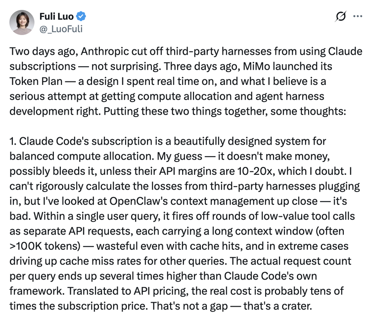相比于错误理解成“封禁”并第一时间联想到“过河拆桥”的一堆讨论,小米 MiMo 大模型负责人罗福莉的一篇长文是少有的对这个事情真正认真分析,并聊到点子上的。