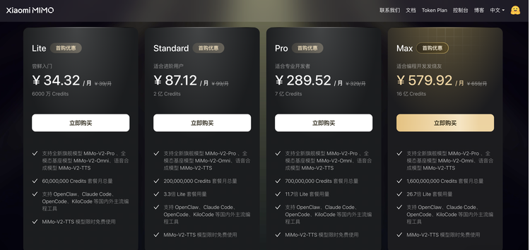 MiMo 的 Token Plan 走的是另一条路。MiMo 没有封掉第三方入口,而是改变了计费结构:按实际 token 消耗量配额,开发者购买以 Credit 为单位的 token 额度。