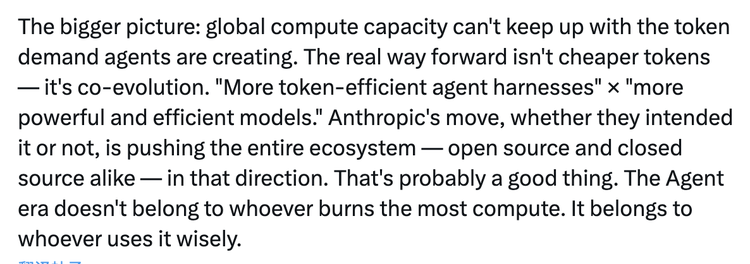 她写道:”全球算力的供给速度,已经追不上 Agent 场景下 token 消耗的增速。真正的出路不是更便宜的 token,而是协同进化,更高 token 效率的 agent harness,乘以更强大、更高效的模型。Anthropic 这次,不管主观意图是什么,客观上把整个生态,无论开源还是闭源,都推向了这个方向。Agent 时代不属于烧算力最多的人,而属于用算力最聪明的人。”