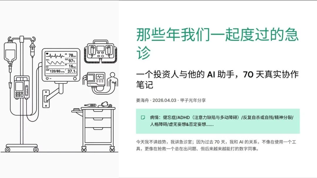 在4月3日「甲子光年」举行的一场内部分享活动中,姜海舟进行了一次“非标准意义的技术讲解”:尽管他现场展示了OpenClaw的能力,但更多的时间,他是作为一线实践者在进行“事故复盘”——系统崩溃、记忆失效、流程错乱,而一间被他反复提及的“AI急诊室”,成为理解企业AI化当下阶段的关键隐喻。