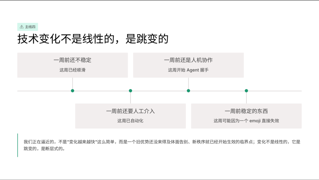Tim Urban描述的DPU间隔正在急剧缩短。我不知道“吓尿点”具体是哪天,但我感受到的节奏是这样的:等你想清楚了,局面已经变了。等你选好了工具,工具已经迭代了。等你做完了培训,培训的内容已经过时了。