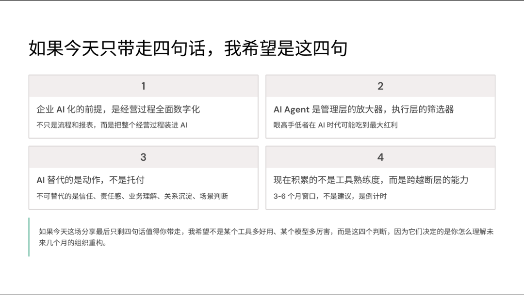 先干的人先长手感。先把经营过程数字化的人,先获得AI的真实能力。先让团队从执行者升级为AI指挥官的组织,先赢。