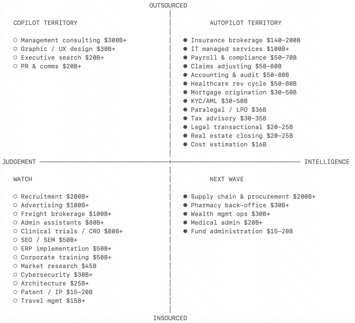 - 自动驾驶(Autopilot)模式:AI直接替客户把活干完,专业人士被跳过了。不卖给律所,卖给那个需要起草合同的公司;不卖给保险经纪人,卖给那个需要买保险的CFO。