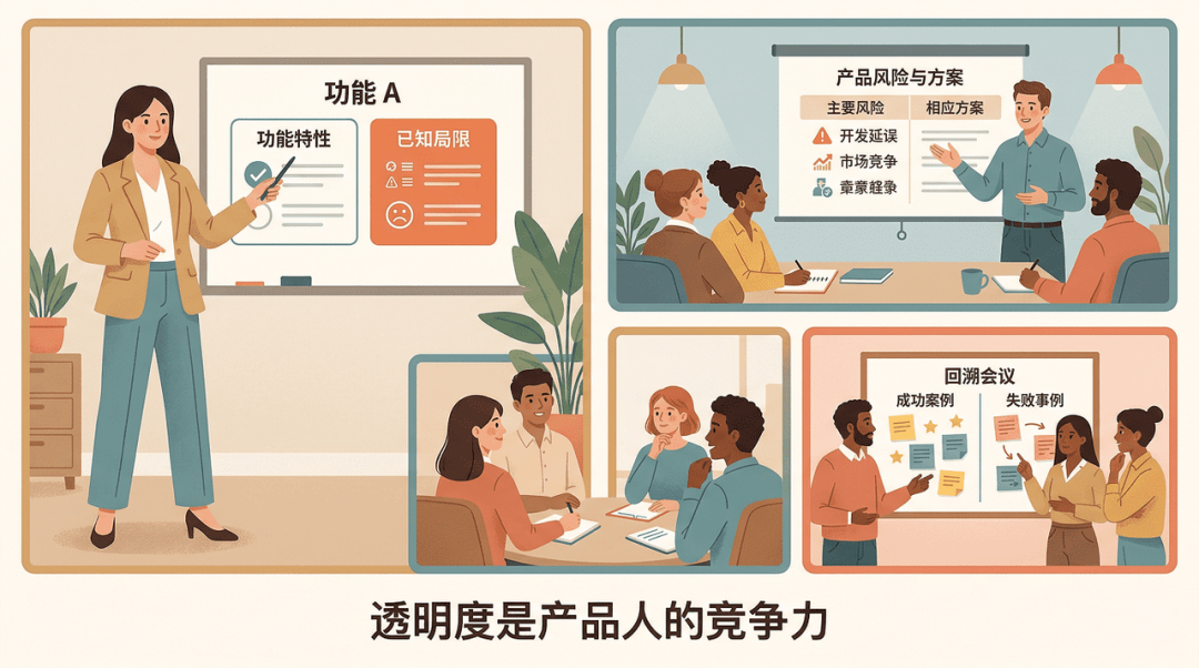 这里有几个具体的应用场景。在功能上线时,与其说”这个功能解决了 XX 问题”,不如同时说”目前在 XX 场景下还有局限,我们的应对方案是……”——后者会让用户觉得你真的了解自己的产品,而不是在卖货。在向老板汇报时,与其把风险藏在 PPT 最后一页,不如在第三页就主动提出来,并给出你的判断和预案——这会让决策者觉得你对局面有掌控感,而不是在等着被追问。在做产品复盘时,把失败案例写得和成功案例一样详细,会让整个团队对你的分析更有信心,因为他们知道你没有在美化结果。
