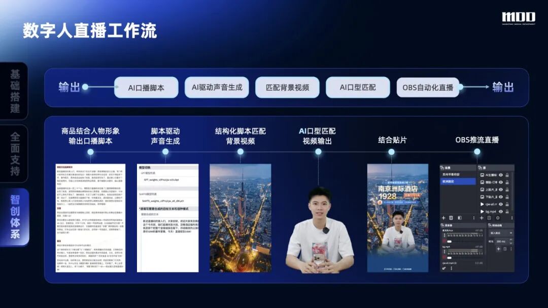 基于这一方法,我们打造了全流程的AI 直播工作流:从 AI 驱动口播脚本智能生成,到声音制作、口型匹配、动作适配,再到背景视频搭配、贴片融合,最终实现 OBS 自动化推流直播,打造了全链路的 AI 自动化直播能力。