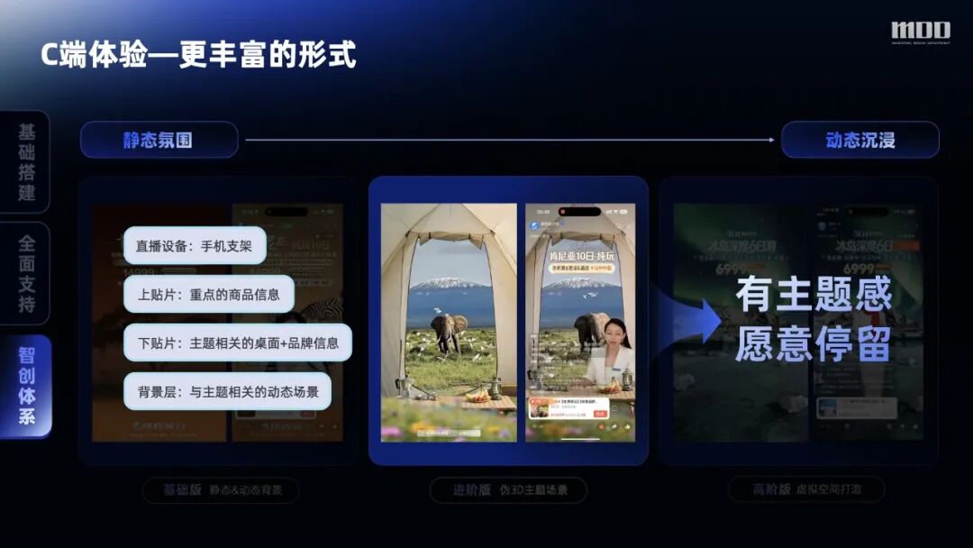 如今用户对直播的期待,早已超越 “看商品、找优惠”,转而追求 “身临其境” 的沉浸感与个性化互动体验。为此,我们打造了灵活的直播间装修方式,从静态基础直播场景到动态虚拟空间打造,分三级实现直播视觉体验的沉浸式升级,满足更高阶的业务需求: