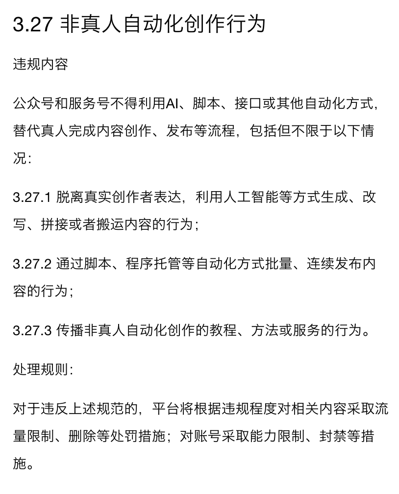 而近日,微信公众号平台更新了「微信公众平台运营规范」,里面就新增了规则,将「非真人自动化创作的行为」纳入违规规则中,新规则明确指出三点: