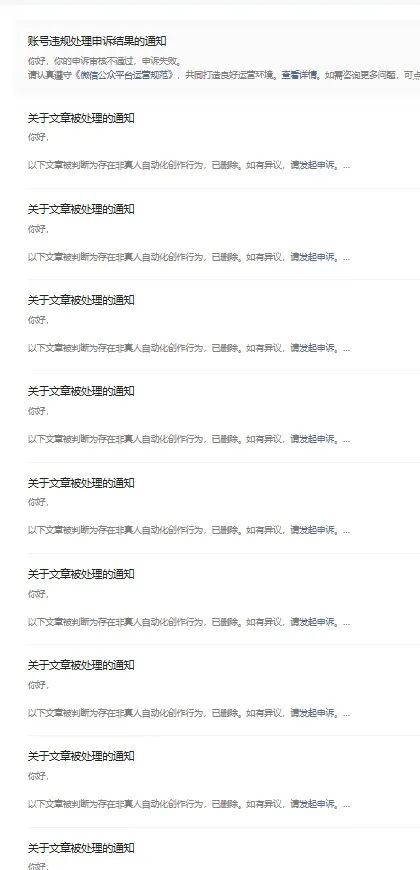 最近有很多网友表示以前发布的公众号文章被删除,删除的理由就是平台判断该文章存在非真人自动化创作行为,申诉也没有用。