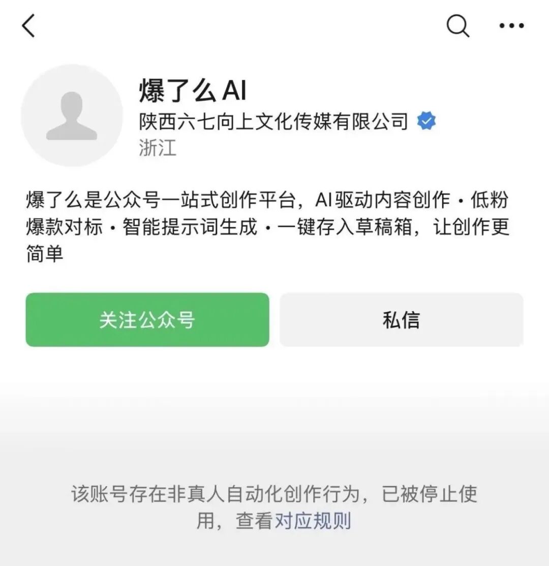 而那个「夫妻AI写公众号年赚200万」的相关账号也被封禁了,提示该账号存在非真人自动化创作行为。