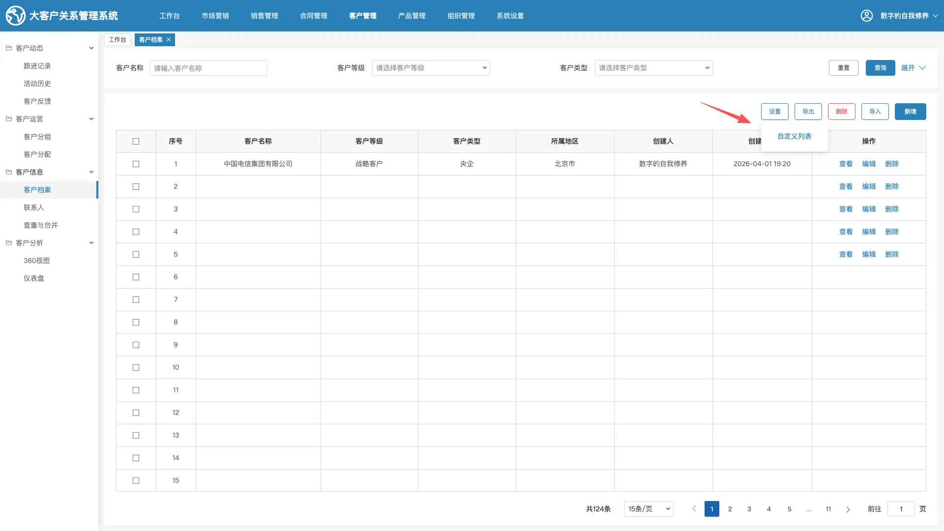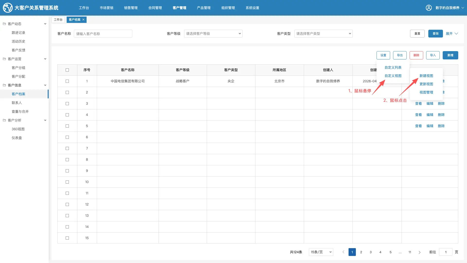 第一步: 鼠标悬停在操作栏的“设置”按钮时,不仅显示“自定义列表”,再增加一个“自定义视图”选项。
