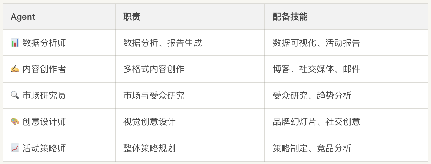 用这个方法,我们可以搭建一个 5 个 Agent、12 项技能的完整团队。