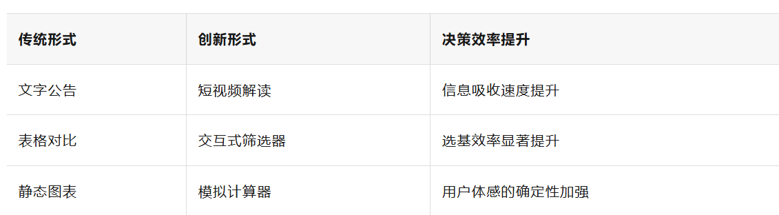 关键洞察:在基金运营中,形式创新是让复杂变简单,让简单变有趣。当用户不再觉得投资基金是一件非常难非常沉重的事情,也会更愿意了解。