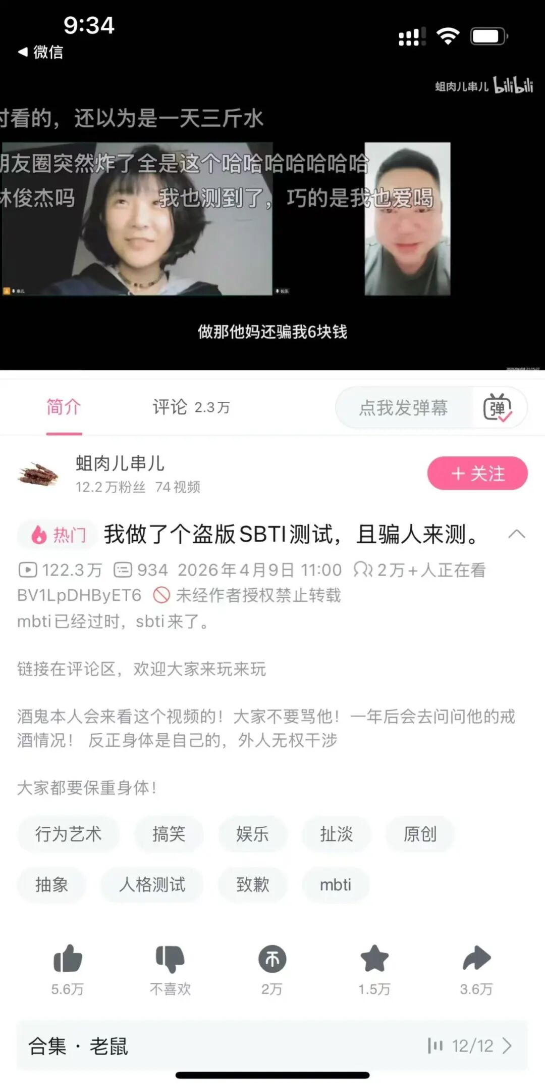 那位博主叫“Q 肉儿串儿”,之前的名字叫“蛆肉儿串儿”。4 月 9 日傍晚,她在 B 站发了一条启动视频,标题就很直接:《我做了个盗版 SBTI 测试,且骗人来测》。后来这条视频一路跑到破 213 万播放,也把她从 10 万出头的粉丝,直接推到了 13.2 万+