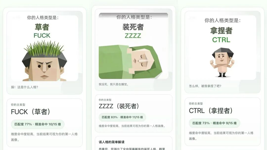它连标签都取得很贼。吗喽、装死者、酒鬼、小丑、狗屎人、送钱者……这些词没有一个高级,却几乎每一个都像你生活里会冒出来的活人外号。它不是在给你一个严肃人格结论,而是在用最短的词,把你一下子拖进那个“我靠,这说的不会就是我吧”的瞬间。再加上她没有把自己摆在镜头中央,而是借了 MBTI 的公共认知当外壳,借了一个不知情朋友的真实反应当引信,借了自嘲和羞耻感混合的情绪当燃料,再借关系链完成扩散,这才让一个 80 分的轻产品变成了一次社会化表达。