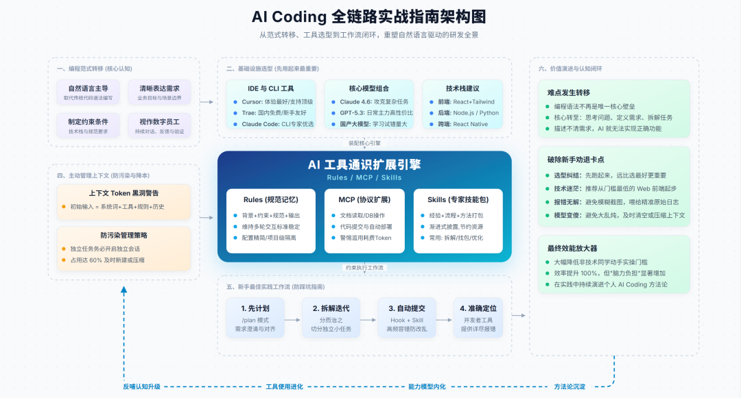 AI Coding正从"写代码"转向"说清需求"——编程语法不再重要,清晰表达需求、约束条件和预期结果才是关键。工具选择上"先用起来"比"选最好"重要:优先IDE(Cursor/Trae)而非命令行,优先Web而非App。模型才是灵魂,Claude 4.6最强但易封号,GPT-5.3性价比高,国产模型适合练手。技术栈建议Python/Node.js后端+React前端,配合MCP扩展实现自动化。真正劝退人的不是不会写代码,而是不知道从哪里开始。