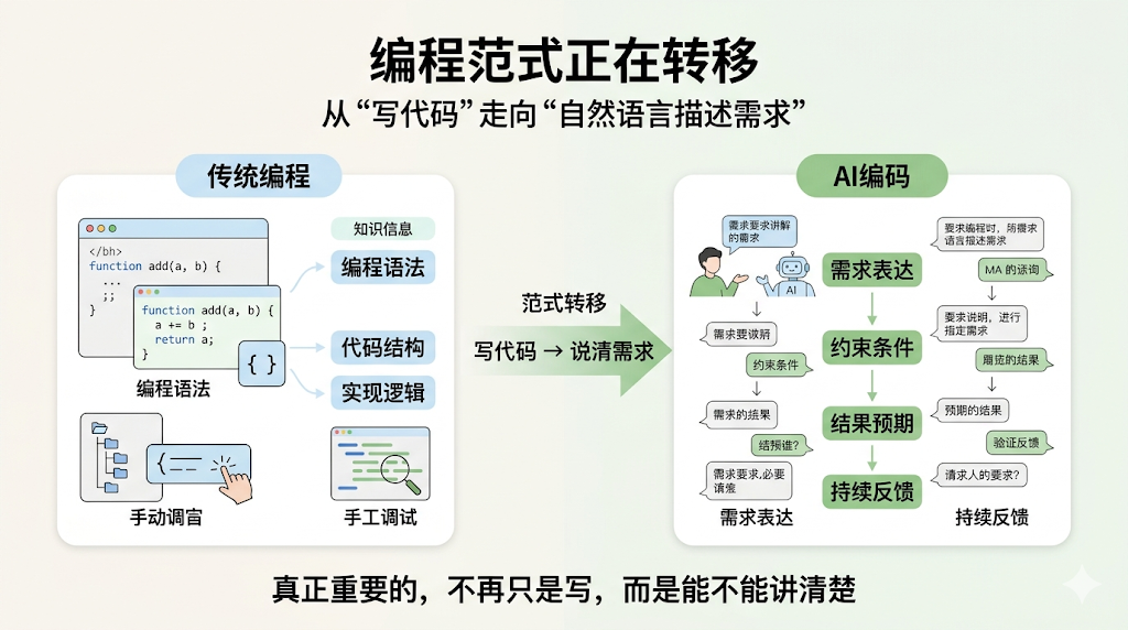以前我们关注的是编程语法、代码结构、实现逻辑,而现在更重要的是能否清晰地表达需求、约束条件和期望结果,至于怎么实现全部交给 AI。