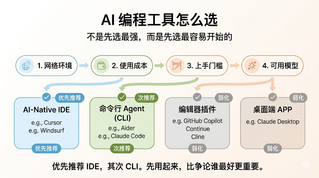 这里的决策逻辑是:1. 网络环境 2. 使用成本 3. 上手门槛 4. 能用的模型