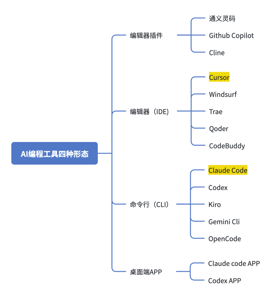下面我们看下国内和国外主流的AI编程工具,不完全列举,这些工具主要分为四种产品形态:编辑器插件、编辑器(IDE)、命令行(CLI)、桌面端APP。