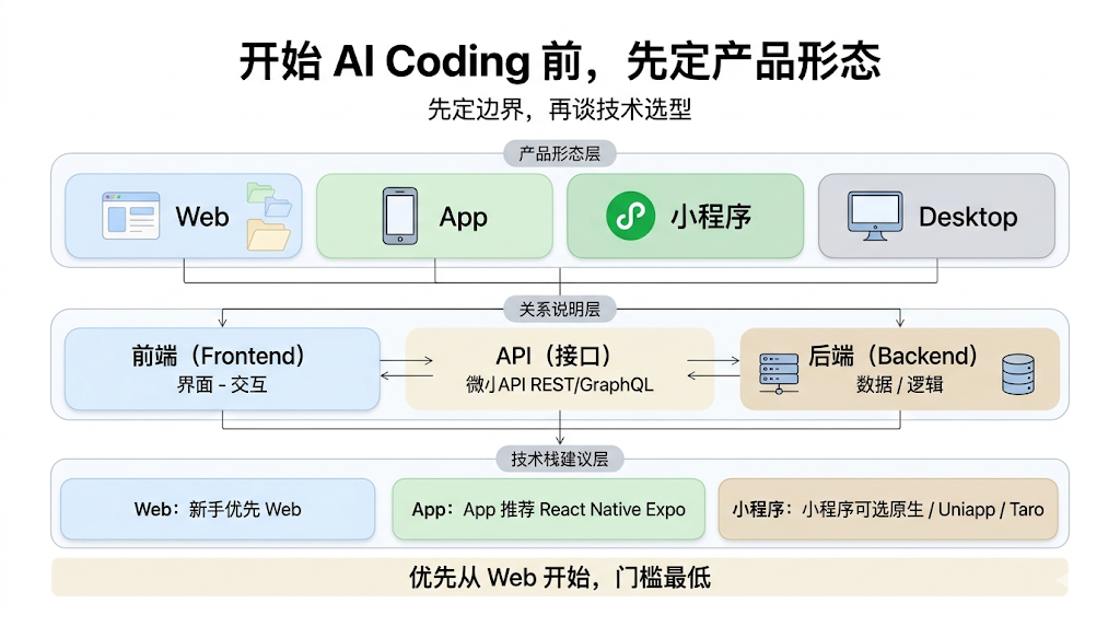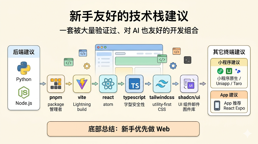 后端技术栈建议使用 Python 或 Node.js,这两者对 AI 都非常友好,生态成熟,环境依赖简单,AI 生成代码的质量和稳定性也更高。