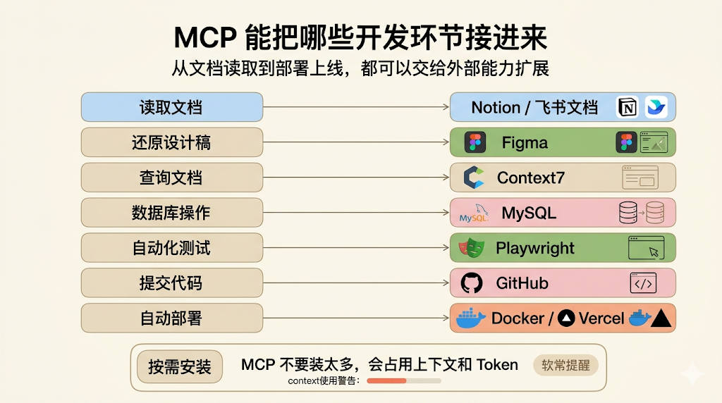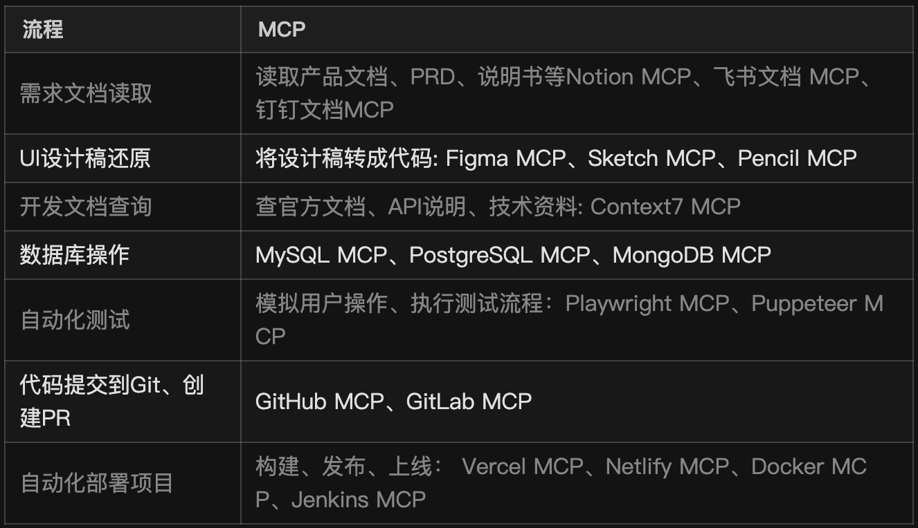 其实,对应到传统软件开发流程中的每个环节,我们都可以借助 MCP 来扩展编程工具的能力。