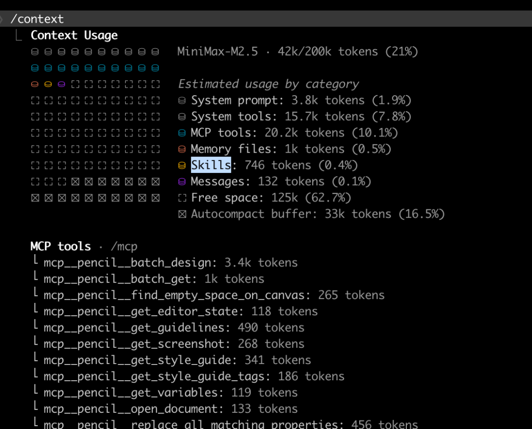 下面以Claude code为例,打开一个新的会话,在没有任何历史上下文的情况下,MCP就占据了 10% 的上下文空间,还有其它系统提示词和系统工具的占用,我们真正能使用的上下文空间只有 80%: