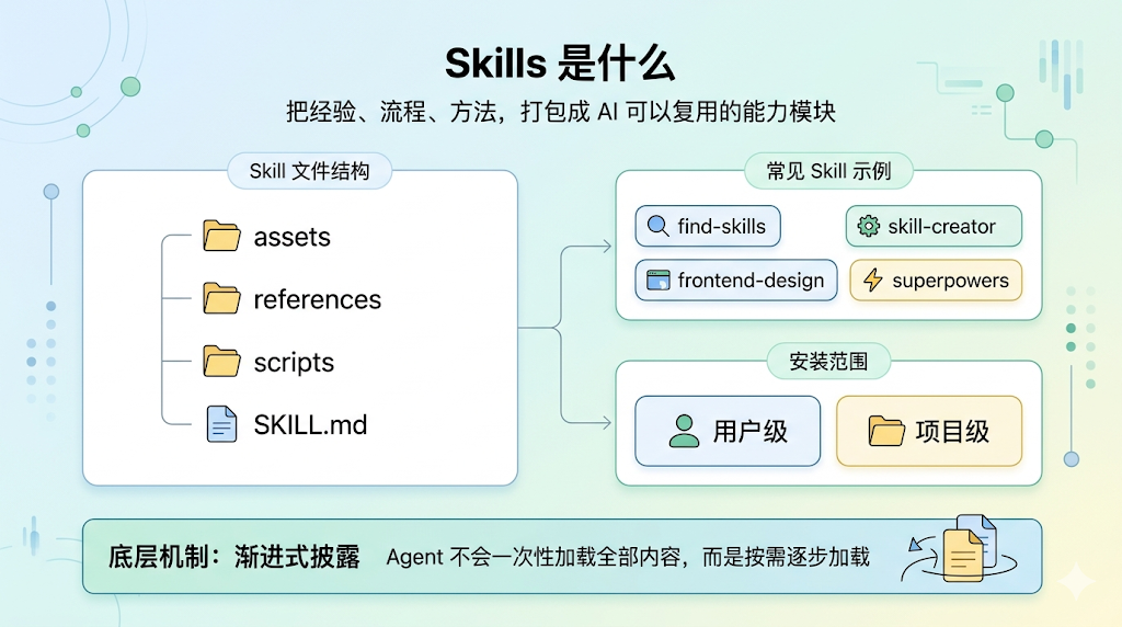 Skills 就是把我们的经验 + 流程 + 方法,打包成一个 AI 可以反复使用的专业能力模块。它跟 MCP一样,都是出自 Anthropic 公司,一个 skill 大致按照如下结构进行组织: