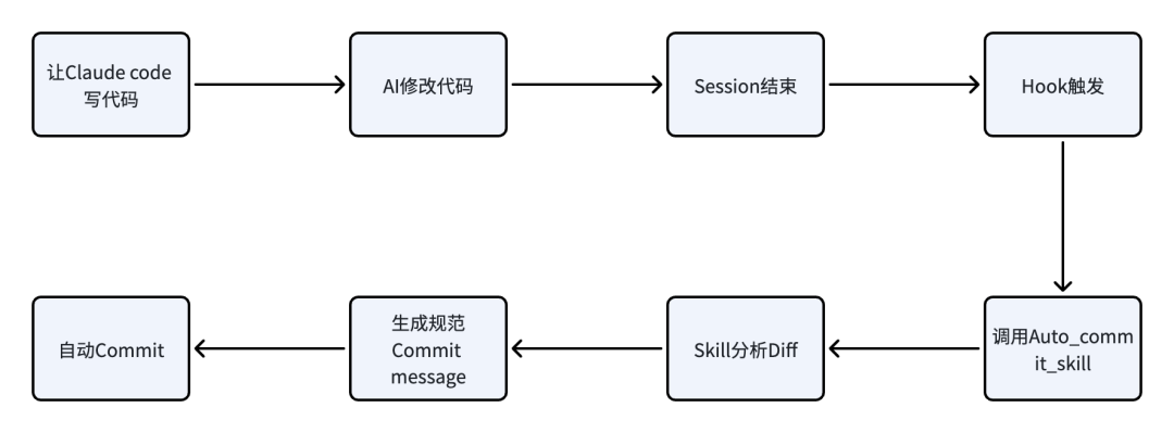但频繁手动提交太过繁琐。在AI编程工具中,我们可以借助 Hook 机制来解决这个问题——每次会话结束后自动触发提交,整个过程无需任何手动操作。