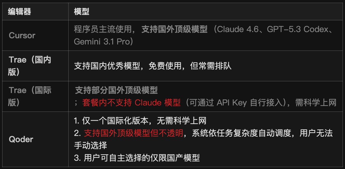 如果你不能解决网络问题,能使用的工具和模型都会受到较大的限制,可选择的只有 Trae 国内版本、Qoder、CodeBuddy、CLI + 国内模型。