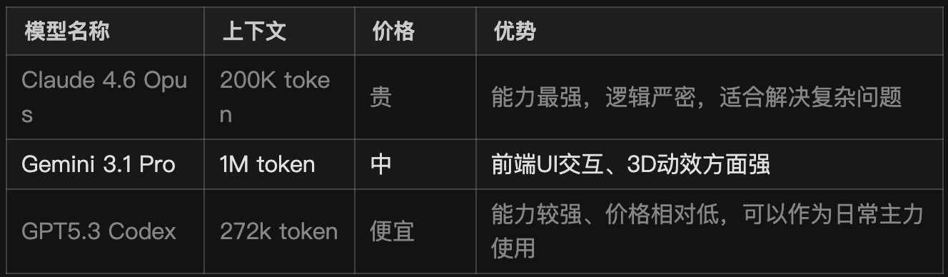 当前编码能力最强的模型是 Claude4.6 Opus / Sonnet,用这种顶级的模型,可以帮我省很多的时间,减少调试和来回沟通的成本。
