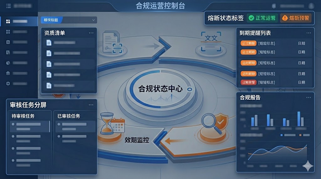 证照管理的核心风险不是提交当天,而是合作过程中悄悄失效。合规模块必须持续扫描未来60天、30天、7天等节点的变化。