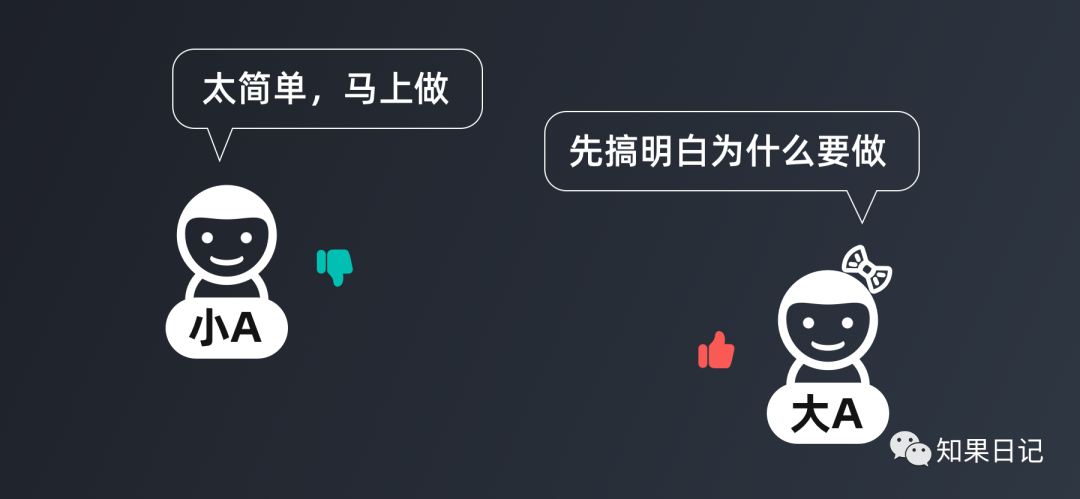 大A不这么想,他思考,为什么领导忽然想要把系统默认主题色优化,现在的主题色是哪里不好,改成什么会更合适…他整理了一些问题,来到领导这里,准备将这些问题解决后再开始做。他知道,只有将这些疑问弄清楚,才合适动手做。