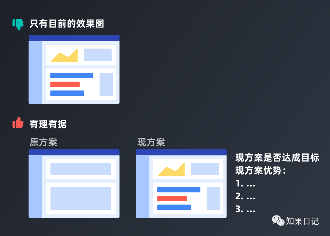 总之,我们需要用一些方法来给证明当前设计方案优于原有方案,或者是达到目标的原因。这些原因不是自己想当然认为的,而是有数据佐证的。