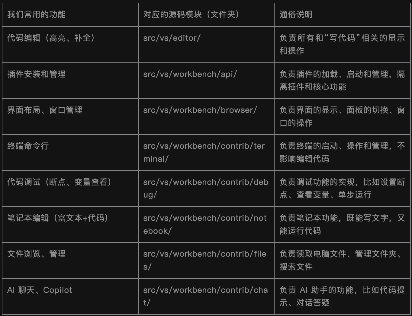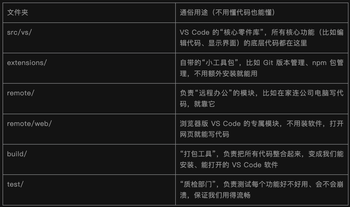 VS Code 的每个功能(比如编辑代码、调试、终端),都有对应的“模块”(源码文件夹),不用看代码,只要知道“功能对应哪个模块”,就能大概明白它的底层逻辑: